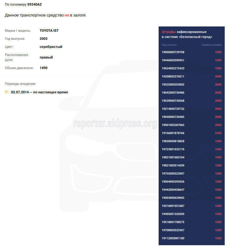 В системе Carcheck у данного авто есть 24 штрафа на общую сумму 42,5 тыс. сомов.