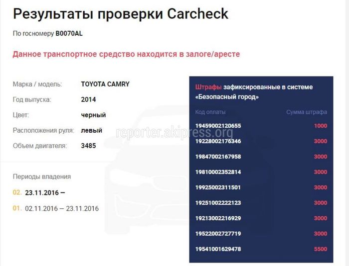 В Carcheck у данного авто есть 9 штрафов на общую сумму 27,5 тыс. сомов.