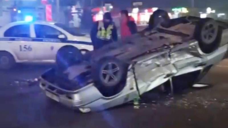 У Аламединского рынка в Бишкеке произошло ДТП с участием двух автомашин. От удара одна из них перевернулась.