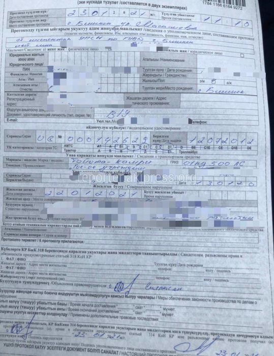 «В отношении водителя автомобиля был составлен протокол по статье 123-1 согласно Кодексу о нарушения. Сумма штрафа 1000 сомов».
