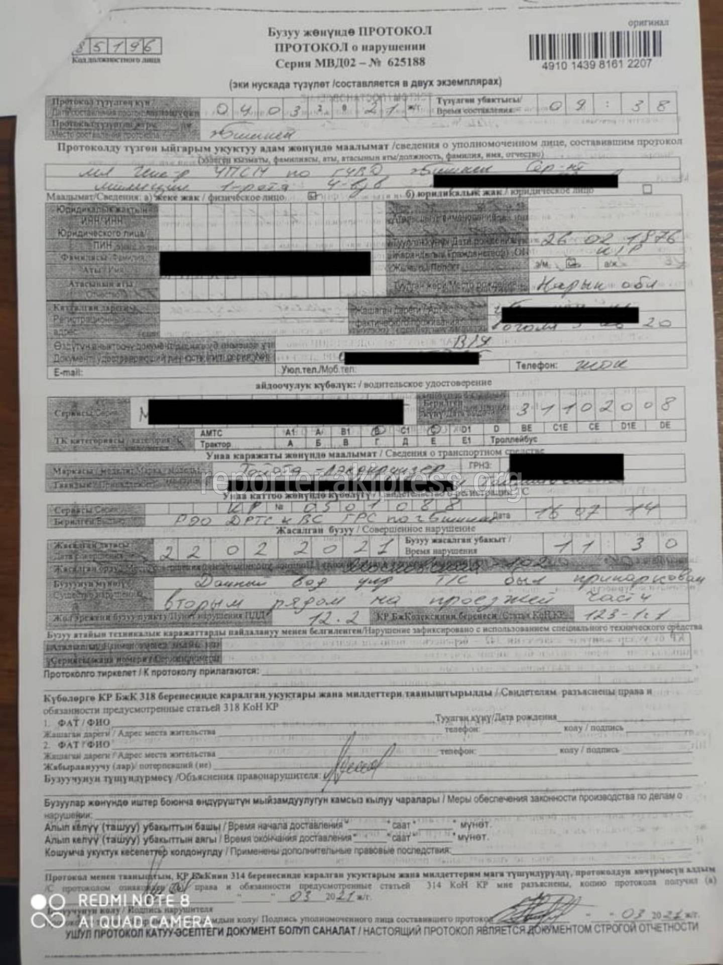 Однако за неправильную остановку составлен протокол в соответствии с пунктом 1 статьи 123-1 Кодекса о нарушениях и наложен штраф в размере 1000 сомов».