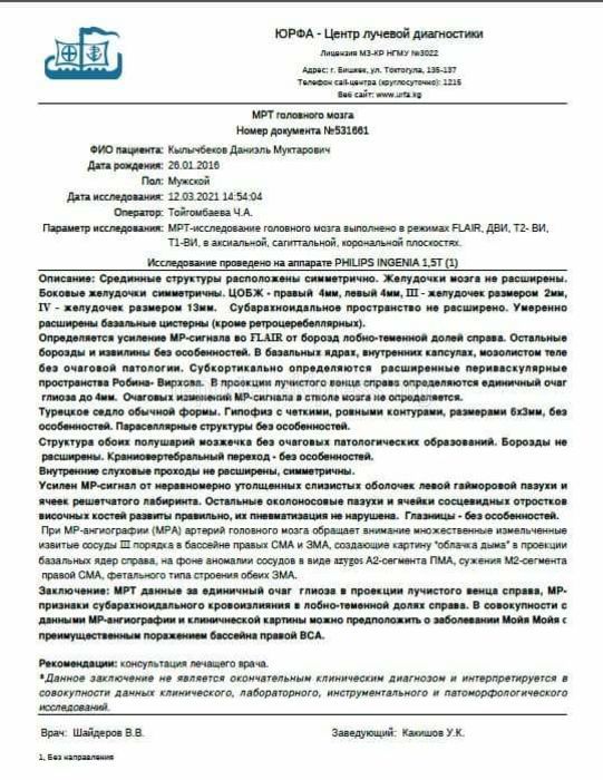 По результатам различных исследований (МРТ, МСКТ, ЭЭГ), анализов и консультаций невропатологов и нейрохирургов был поставлен диагноз болезнь Мойя-Мойя. Это неврологическое расстройство является малоизвестной болезнью сосудов головного мозга. При прогрессировании заболевания артерии и прилегающие сосуды головного мозга сужаются и даже могут быть полностью перекрыты. Организм пытается компенсировать поврежденную циркуляцию крови путем формирования в мозгу сети из мелких сосудов, которые на снимках видны, как «облачные образования».