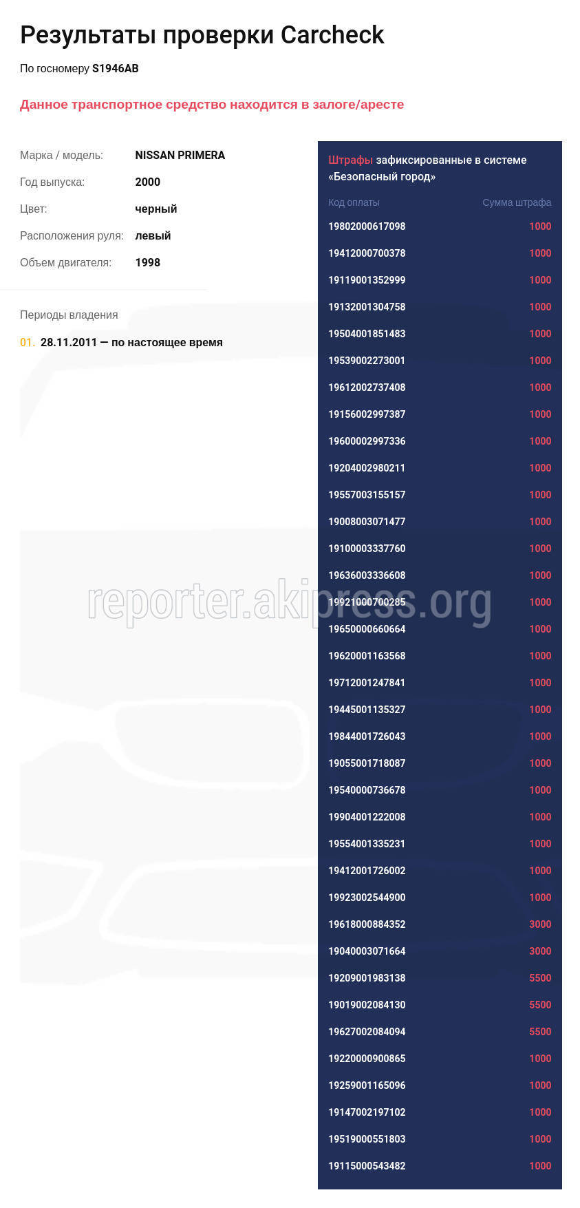 Возле Дворца спорта припаркован «Ниссан», у которого 53,5 тыс. сомов штрафов. Фото 19 нояб. 2021, 16:33 1670 Возле Дворца спорта имени Кожомкула в Бишкеке несколько дней стоит припаркованный автомобиль марки «Ниссан Примера». В Carcheck у данного авто есть 36 штрафов на общую сумму 53,5 тыс. сомов. 12 Есть новость? Сообщи нам по номеру 0550 01 03 11 или через приложение «Репортер АКИpress»! -Поделиться-Твиттер-WhatsApp- Телеграм 1670 Просмотры Читайте Репортер в t.me/ReporterAKIpress