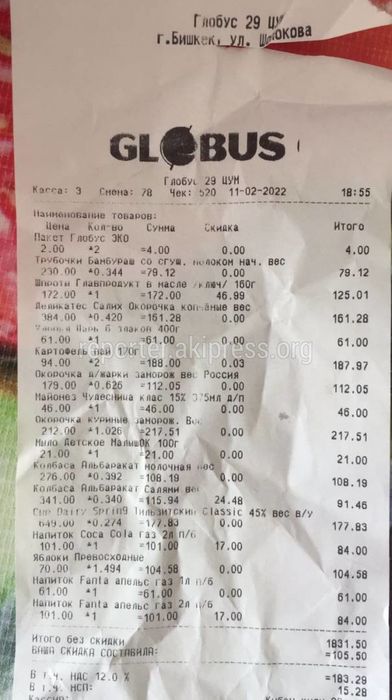 В «Глобусе» в ЦУМе на окорочке изменили дату производства. Видео 14 февр. 2022, 14:37 (обновлено: 14 февр. 2022) 2588 В «Глобус-29» в ЦУМе изменили дату производства куриный окорочков, сообщает бишкекчанка. «Наклеили на старый ценник новый. Изменили дату выпуска куриных окороков от «Салих». Запах у продукта ужасный. Прошу принять меры», - пишет она. 15 Есть новость? Сообщи нам по номеру 0550 01 03 11 или через приложение «Репортер АКИpress»! -Поделиться-Твиттер-WhatsApp- Телеграм 2588 Просмотры Читайте Репортер в t.me/ReporterAKIpress
