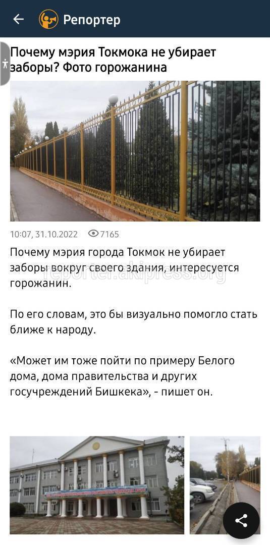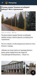 Почему мэрия Токмока до сих пор не убрала забор? - горожанин 30 окт. 2023, 12:06 (обновлено: 30 окт. 2023) 1240 Почему мэрия города Токмок до сих пор не убрала забор, интересуется горожанин. «Почему не хочет стать визуально ближе к народу. Даже белый дом в Бишкеке исполнил указ и был убран забор», - пишет он. 13 Есть новость? Сообщи нам по номеру 0550 01 03 11 или через приложение «Репортер АКИpress»! -Поделиться-Твиттер-WhatsApp- Телеграм 1240 Просмотры Читайте Репортер в t.me/ReporterAKIpress