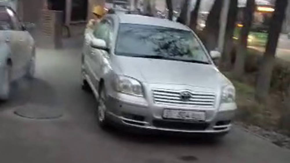 На тротуаре припаркованы «Тойота Авенсис» (госномер 01KG804ADU) и «Тойота Ист» (госномер 01KG321AOI).