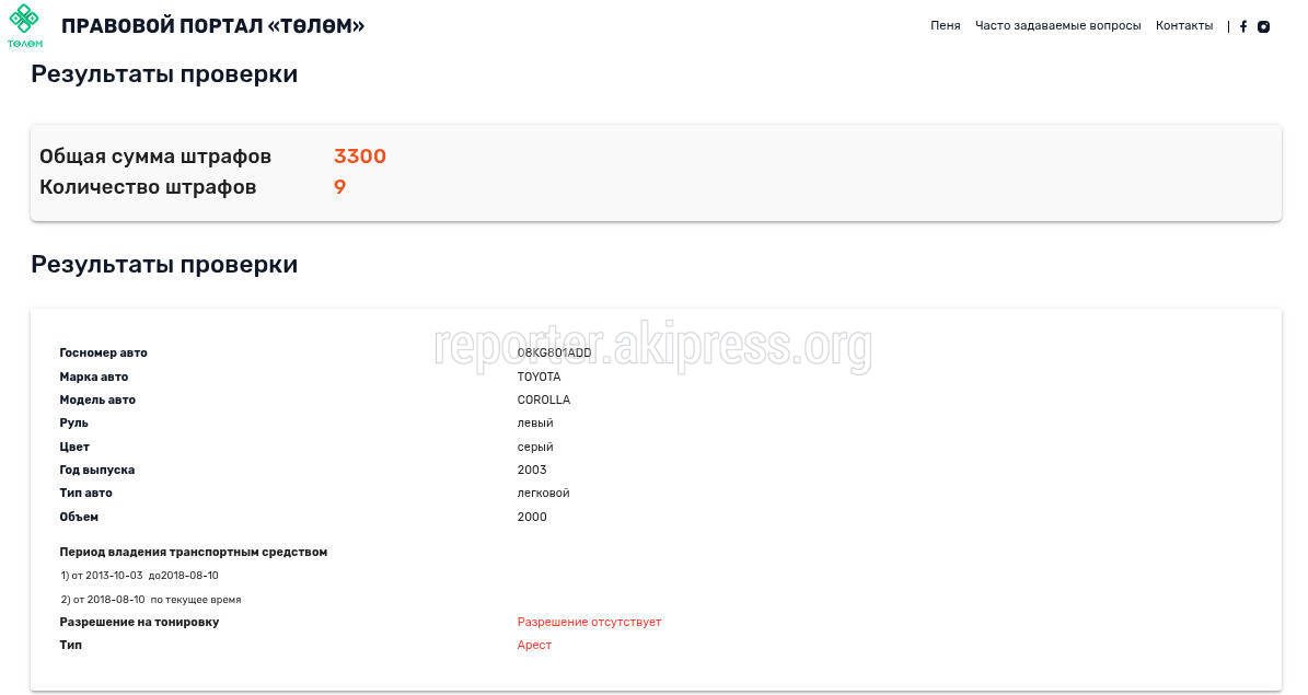 На сайте Tolom.kg у данного авто есть 9 штрафов на общую сумму 3300 сомов.
