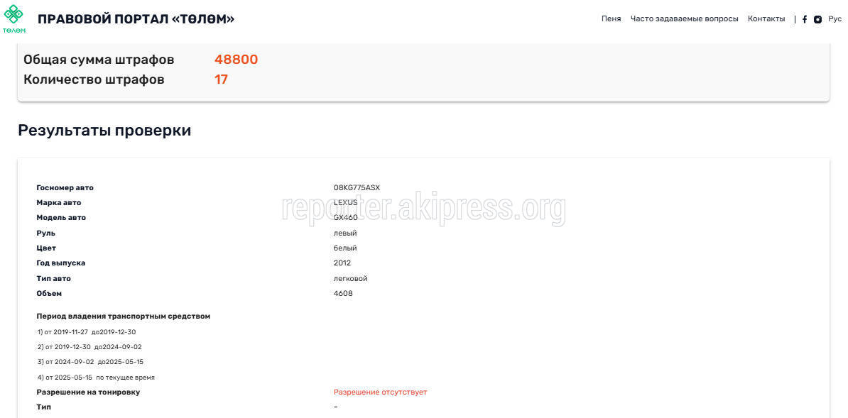 На сайте Tolom.kg у данного авто есть 17 штрафов на общую сумму 48800 сомов.