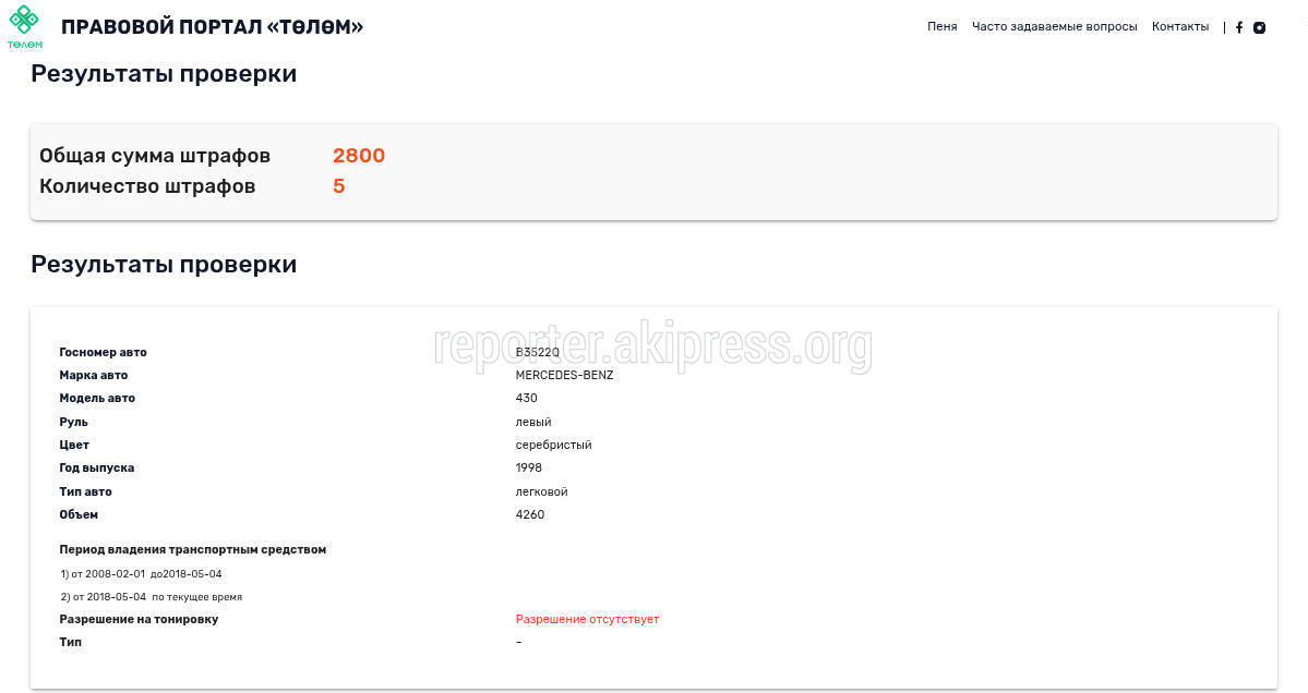 Горожанин жалуется на состояние госномера «Мерседеса». Фото 13 авг. 2025, 11:51 (добавлено: 13 авг. 2025, обновлено: 14 авг. 2025) 1626 Горожанин жалуется на состояние госномера автомобиля «Мерседес-Бенц E430» (госномер B3522Q). «Флаг выцвел, только цифры», - пишет он. На сайте Tolom.kg у данного авто есть 5 штрафов на общую сумму 2800 сомов. 14 Есть новость? Сообщи нам по номеру 0550 01 03 11 или через приложение «Репортер АКИpress»! -Поделиться-Твиттер-WhatsApp- Телеграм 1626 Просмотры Читайте Репортер в t.me/ReporterAKIpress