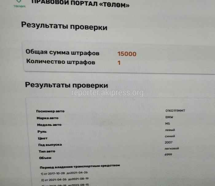 На сайте Tolom.kg у данного автомобиля есть один штраф на сумму 15000 сомов.