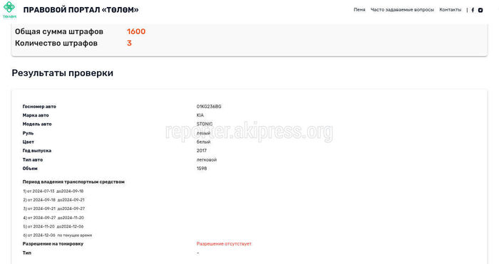 На видео автомобиль «Киа Стоник» (госномер 01KG236BG), у которого 1600 сомов штрафов на сайте Tolom.kg.
