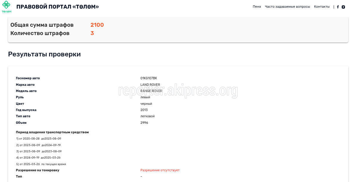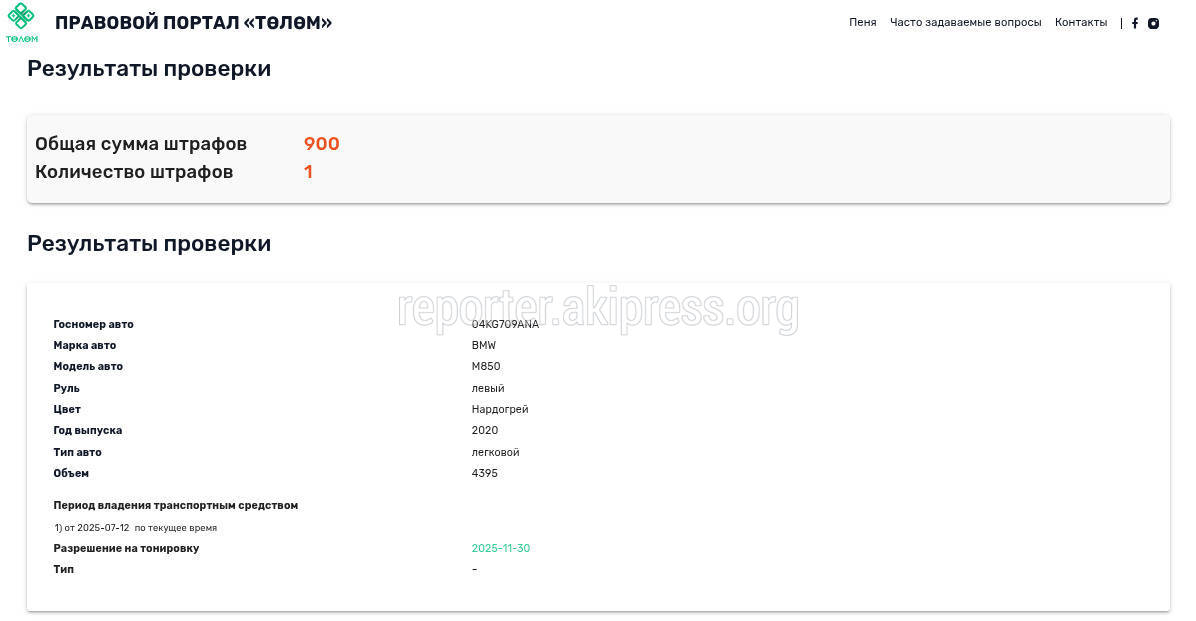 - «Тойота Виндом» (госномер B1599AA), 8300 сомов штрафов на сайте Tolom.kg