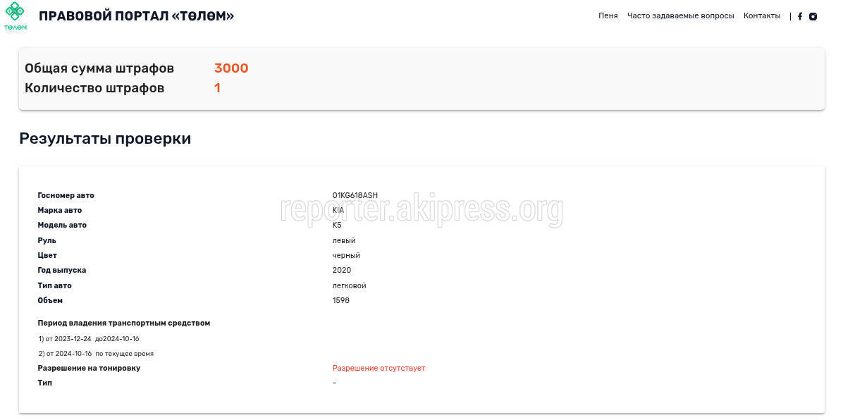 - Киа К5 (госномер 01KG618ASH), 3000 сомов