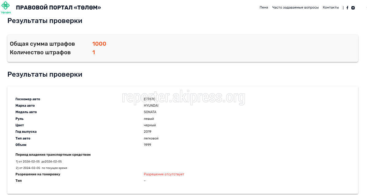- «Хендай Соната» (госномер E7787C), 1000 сомов