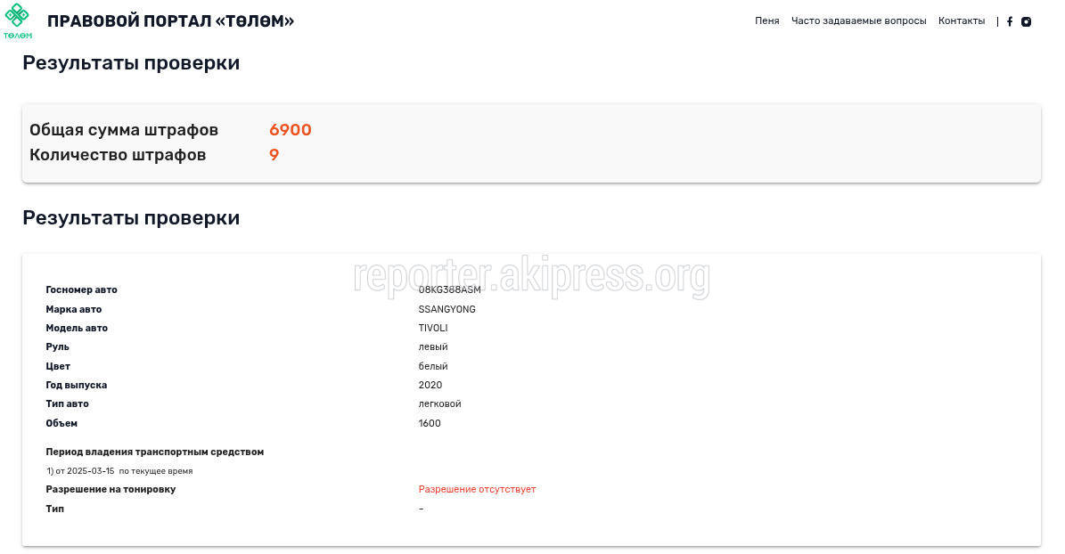 - SSANGYONG TIVOLI (госномер 08KG388ASM), 6900 сомов