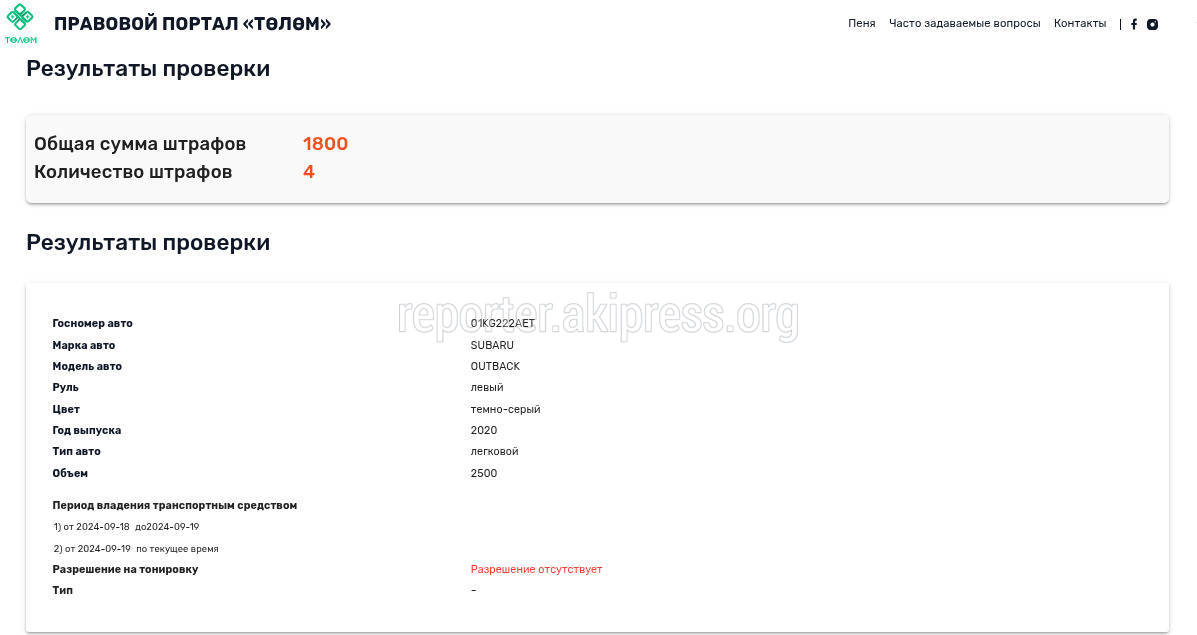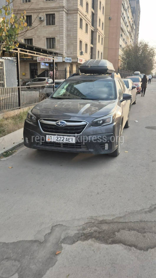 - «Субару Аутбэк» (госномер 01KG222AET), 1800 сомов