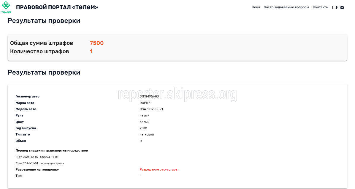 - Roewe (госномер 01KG495ARX), 7500 сомов