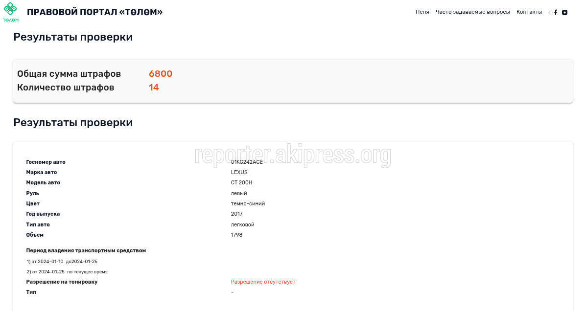 - Lexus CT 200H (госномер 01KG242ACE), 6800 сомов