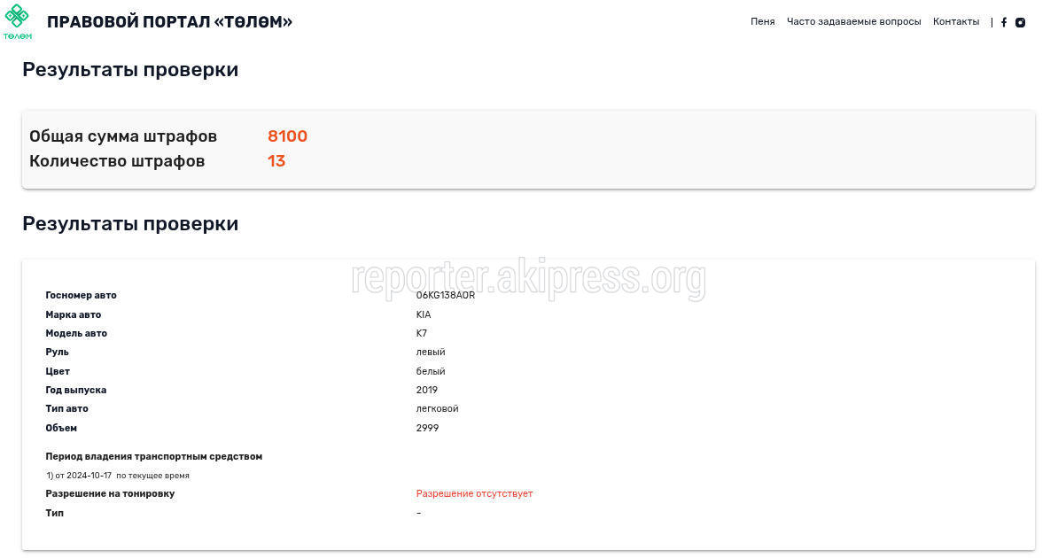 - «Киа К7» (госномер 06KG138AOR), 8100 сомов на сайте Tolom.kg