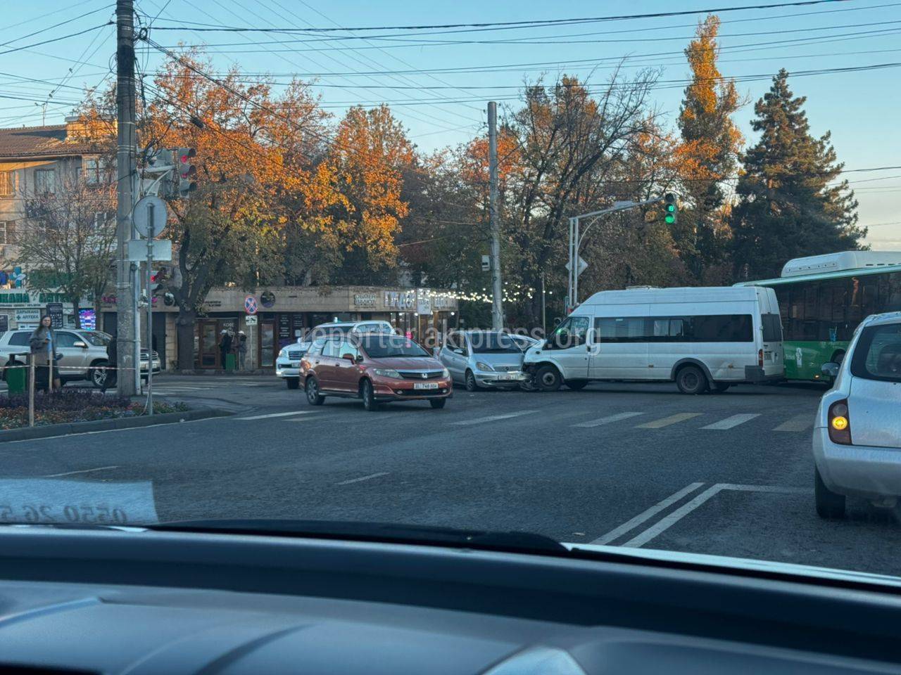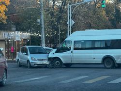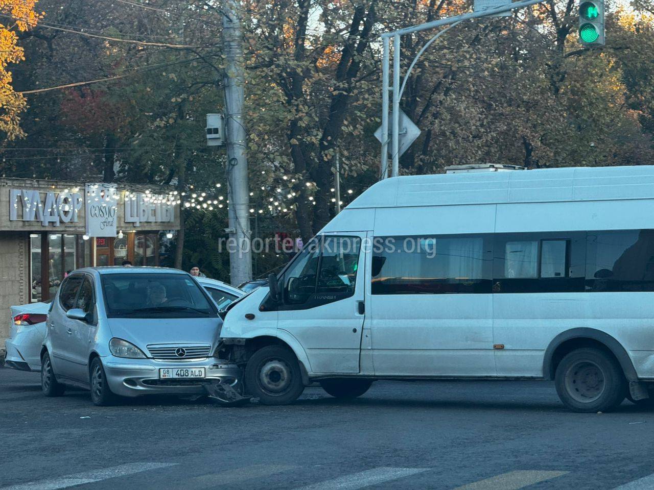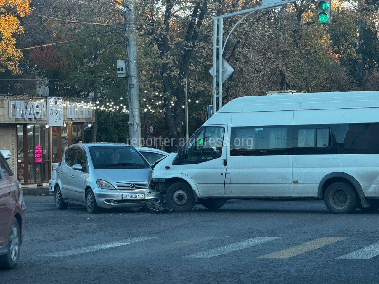 «На перекрестке столинулись «Форд Транзит» (госномер 01KG188APK) и «Мерседес-Бенц А160» (госномер 08KG408ALD). Очень затрудняет движение», - пишет очевидец.