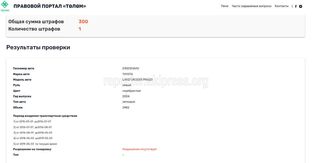 На сайте Tolom.kg у данного авто есть 300 сомов штрафов.