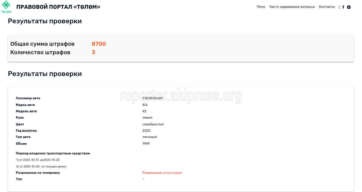 На сайте Tolom.kg у данного авто есть 3 штрафа на общую сумму 8700 сомов.