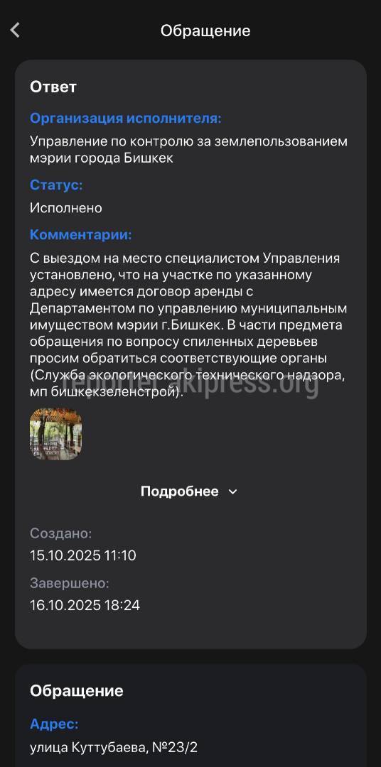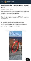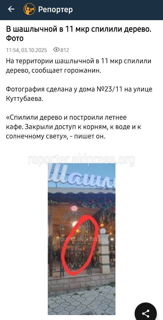 На территории шашлычной в 11 мкр спилили дерево. Фото 13 нояб. 2025, 13:25 (обновлено: 10:31, 14 нояб. 2025) 947 На территории шашлычной в 11 мкр спилили дерево, сообщает горожанин. Фотография сделана у дома №23/2 на улице Куттубаева. «Спилили дерево и построили летнее кафе. Закрыли доступ к корням, к воде и к солнечному свету», - пишет он. 13 Есть новость? Сообщи нам по номеру 0550 01 03 11 или через приложение «Репортер АКИpress»! -Поделиться-Твиттер-WhatsApp- Телеграм 947 Просмотры Читайте Репортер в t.me/ReporterAKIpress