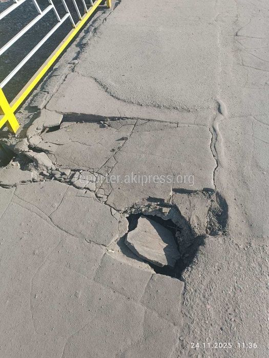 Дыра на мосту на ул.Салиевой. Фото 27 нояб. 2025, 11:18 2379 На мосту через реку Аламедин образовалась дыра, сообщает горожанин. Фотография сделана на улице Салиевой. 11 Место на карте: Есть новость? Сообщи нам по номеру 0550 01 03 11 или через приложение «Репортер АКИpress»! -Поделиться-Твиттер-WhatsApp- Телеграм 2379 Просмотры Читайте Репортер в t.me/ReporterAKIpress