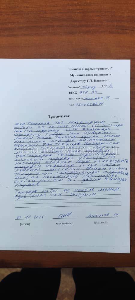 «По информации МП «Бишкекский городской транспорт», водитель автобуса №153 (госномер 01KG944AZ) Ашымов Ч. был вызван в отдел обеспечения безопасности движения муниципального предприятия. С ним проведена разъяснительная беседа на основании водительской инструкции, получено письменное объяснение, ему сделано предупреждение о необходимости корректного обслуживания пассажиров.