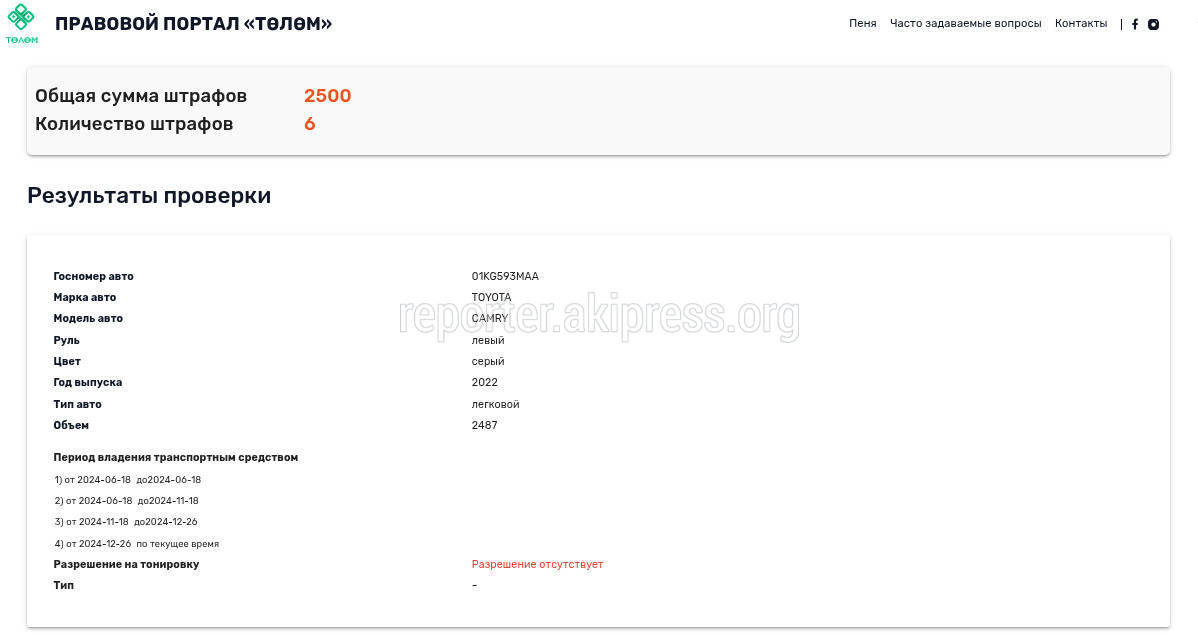 На сайте Tolom.kg у данного авто есть 6 штрафов на общую сумму 2500 сомов.