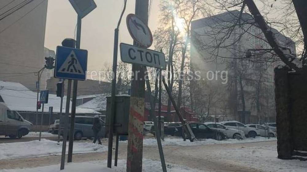Деформацию дорожного знака на пересечение улиц Фрунзе и Уметалиева устранили сотрудники МП «Бишкекасфальтсервис». Об этом сообщили в пресс-службе мэрии.