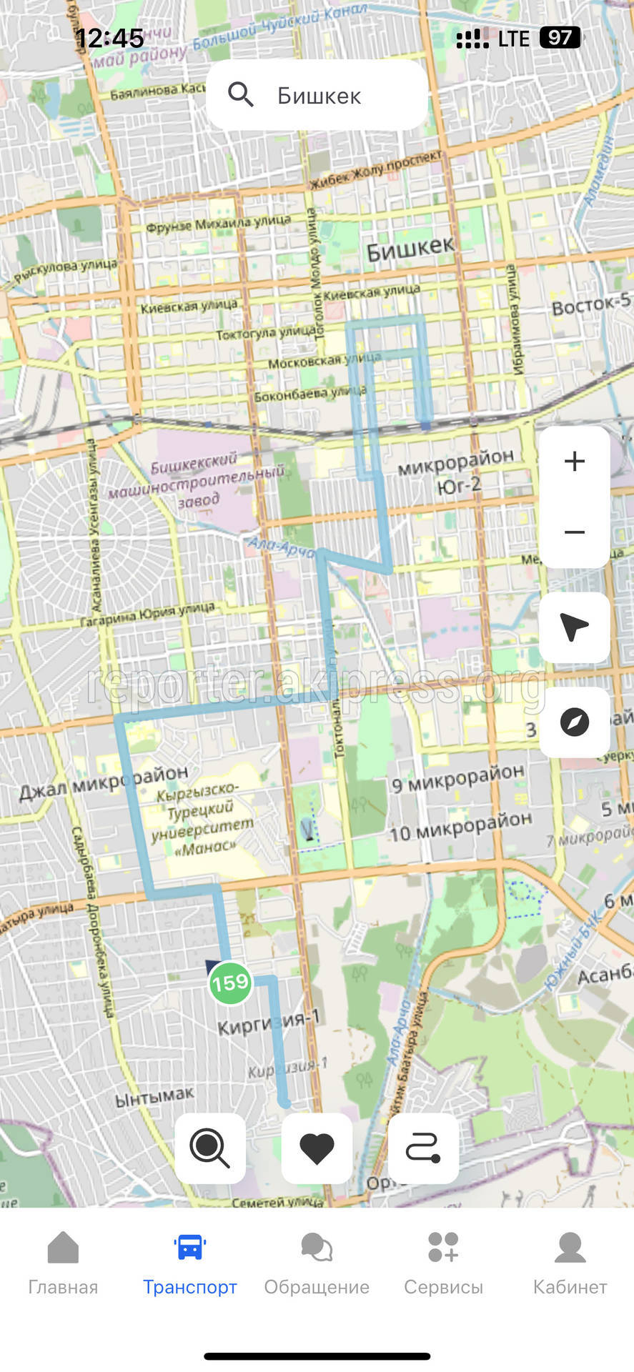Почему отсутствуют автобусы на маршруте 159? - бишкекчанин 24 янв. 2026, 12:48 (обновлено: 13:55, 24 янв. 2026) 3134 Почему отсутствуют автобусы на маршруте 159, пишет житель города Бишкек. «На карте показывает только 1 автобус. Не смогли уехать с улицы Логвиненко до микрорайона Джала, не дождались», - жалуется он. 11 Есть новость? Сообщи нам по номеру 0550 01 03 11 или через приложение «Репортер АКИpress»! -Поделиться-Твиттер-WhatsApp- Телеграм 3134 Просмотры Читайте Репортер в t.me/ReporterAKIpress