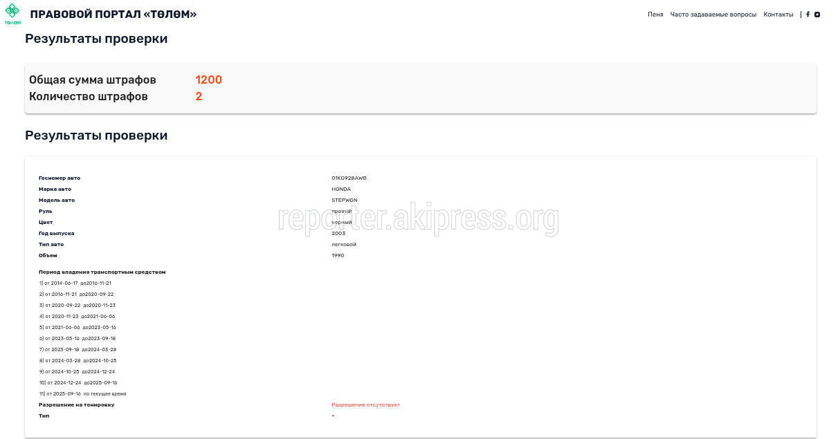 На сайте Tolom.kg у «Хонды» есть два штрафа на общую сумму 1200 сомов.