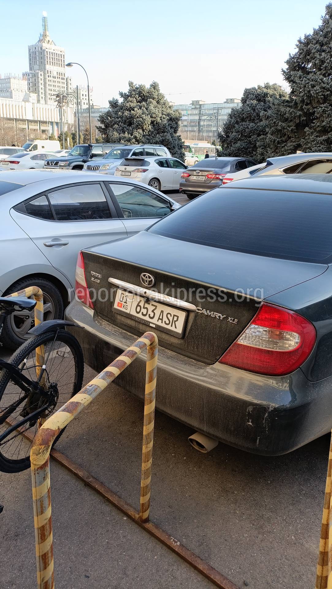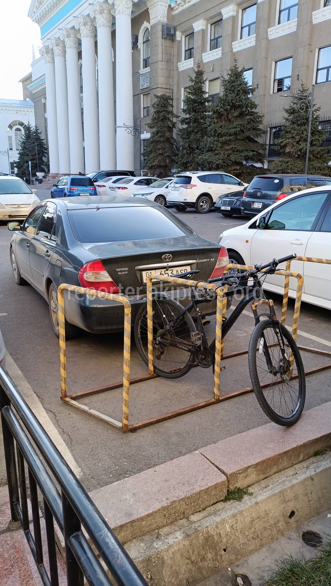 Возле здания мэрии города Бишкек водители паркуются перед велосипедной парковкой, закрывая въезд и выезд велосипедам, сообщает горожанин.