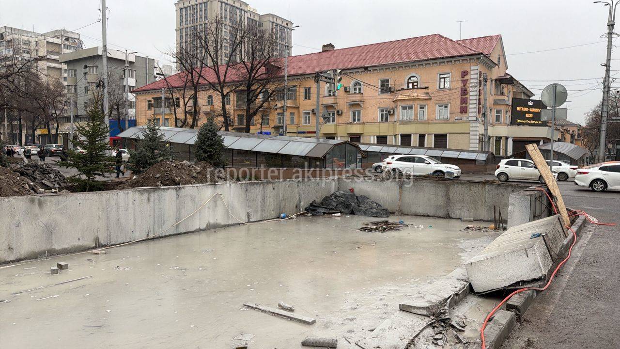 По информации Свердловского акимиата, в рамках строительства «ОЛД Бишкек» на пересечении пр.Чуй и ул. Абдрахманова проводятся работы по строительству подземного перехода. Согласно информации прораба проекта, ранее возведенный фундамент был построен для строительства пирамиды. На сегодняшний день проводятся демонтажные работы, и после гидроизоляции данного объекта будет производиться озеленение и благоустройство данной территории. Срок завершения работ до 5 марта текущего года.