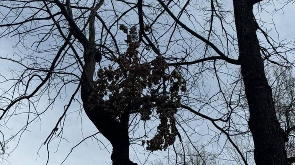 На бульваре Эркиндик сломанная ветка висит между деревьев