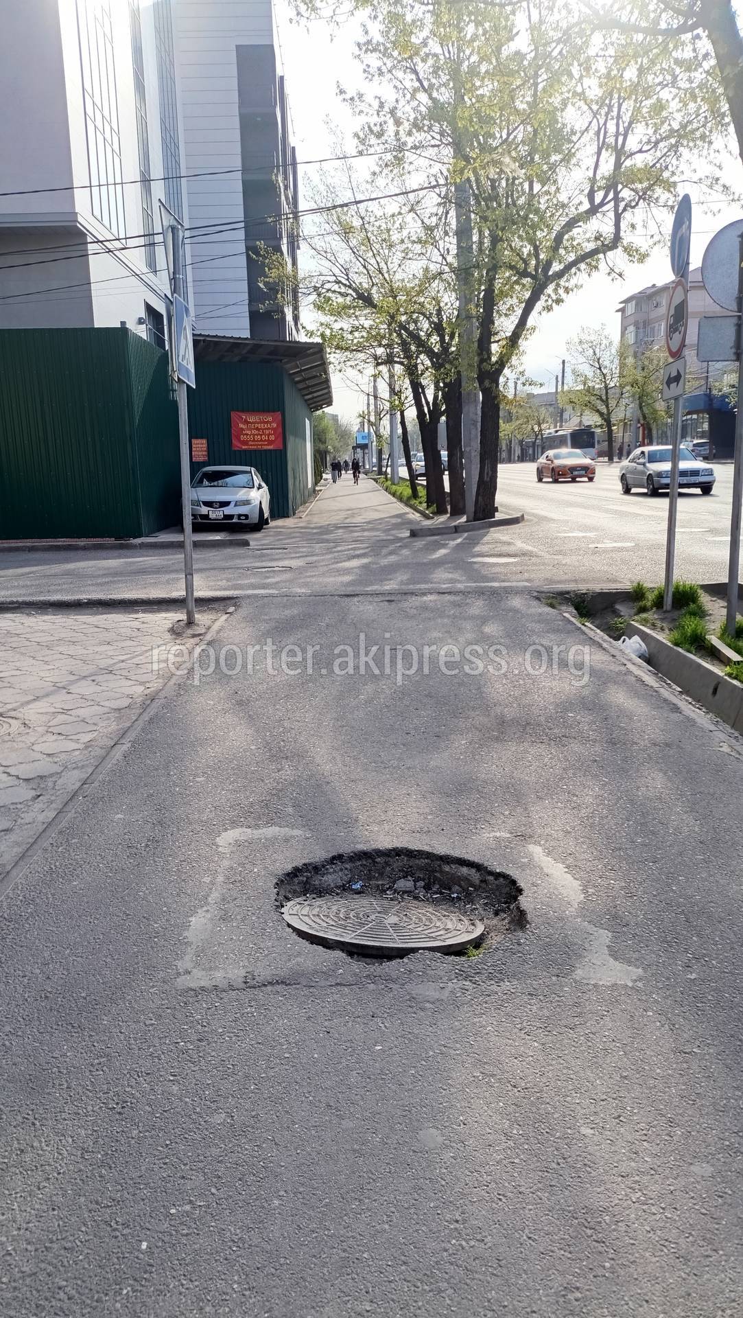 На Айтматова—Ахунбаева провалился люк, сообщил житель. «Тротуар относительно новый, люк провалился из-за едущих машин по тротуару», - считает он.