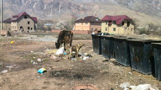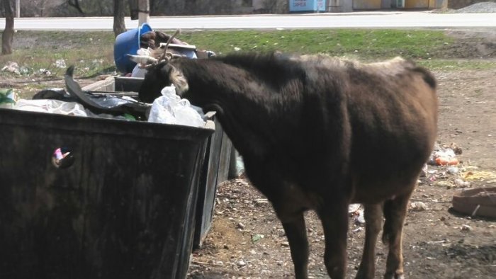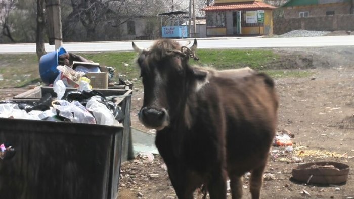 В Кара-Куле Жалал-Абадской области скот поедает мусор из мусорных баков (фото)