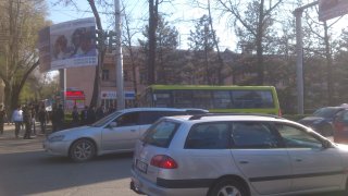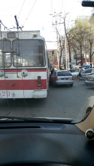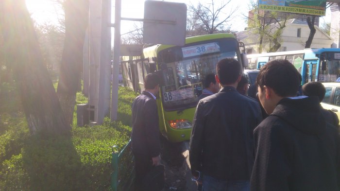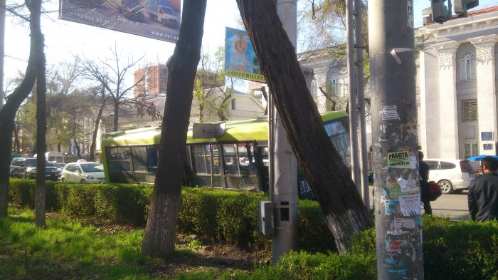 В Бишкеке на пересечении ул. Тоголок Молдо и пр. Чуй 16 апреля автобус провалился в арык, пытаясь объехать троллейбус, который задел легковую автомашину, сообщает читатель.
