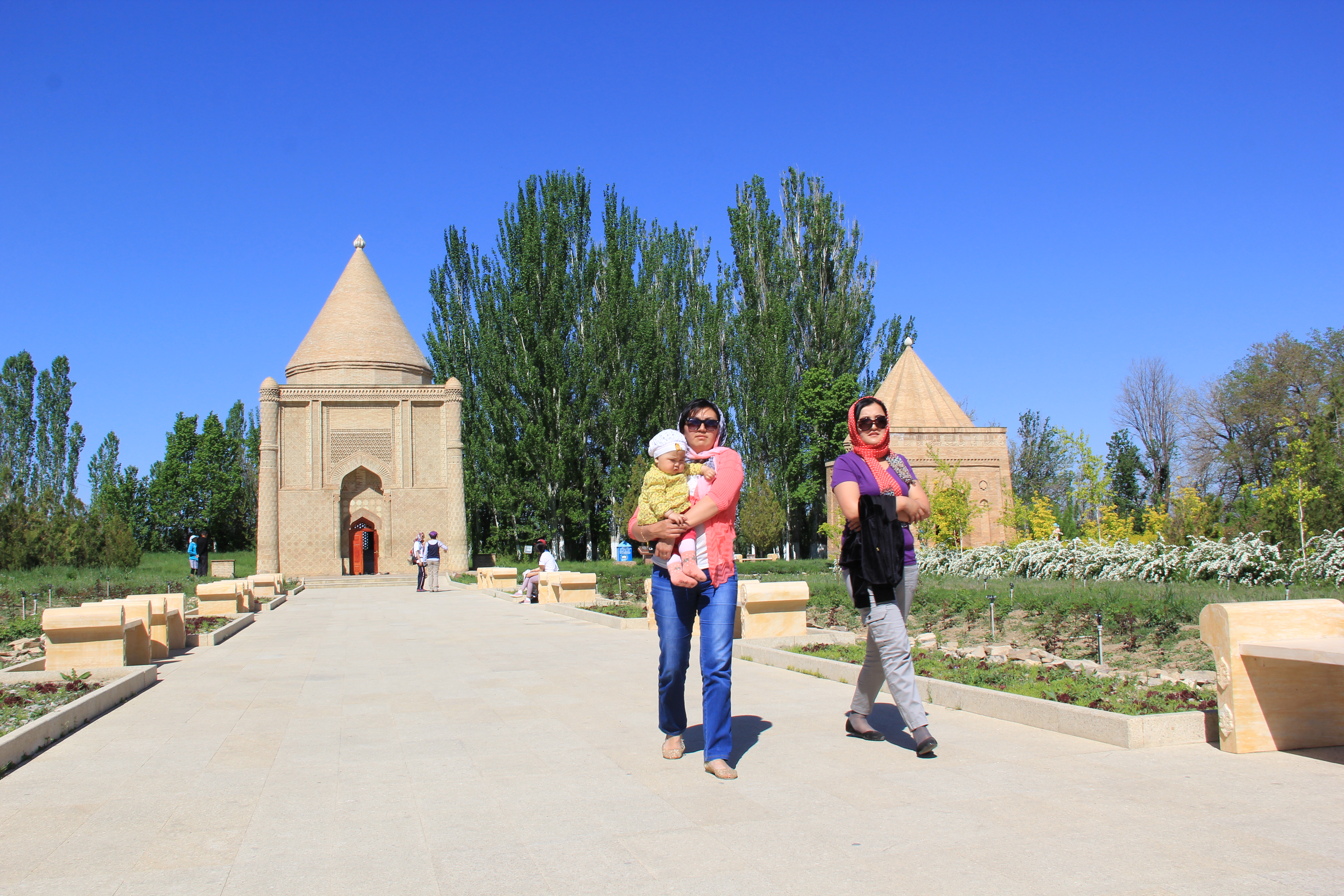 День первый и первая остановка – осмотр мавзолея Айша биби – архитектурного памятника XII века. Существует около 30 версий легенды о любви Айша биби к своему жениху. По самой распространенной из них девушка тайно бежала в Тараз, чтобы увидеть своего возлюбленного Карахана, но погибла на берегу реки от укуса змеи. Скорбя о своей возлюбленной, Карахан воздвиг мавзолей сказочной красоты на месте ее гибели.