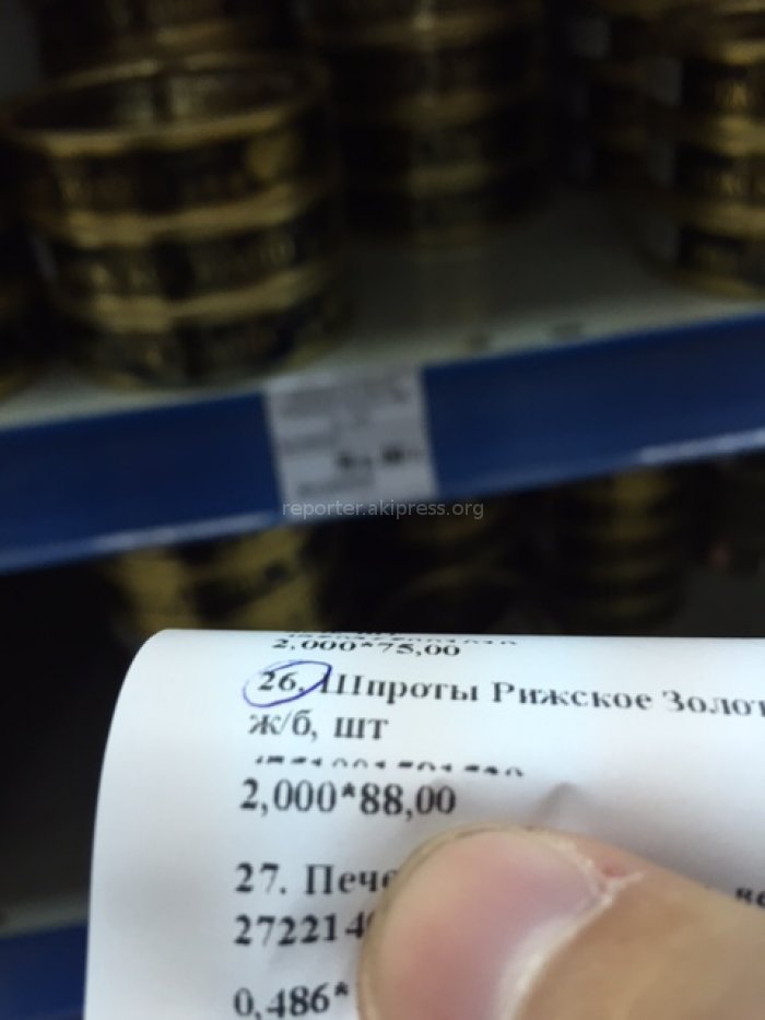 «Прошу принять меры по этому вопросу. На полках указаны одни цены, на кассе пробивают другую сумму. Это не антиреклама, а просто просьба разобраться, может быть это просто ошибка. Поэтому просьба сверить и указывать реальную цену. Ниже приведены фотографии, при покупке шпротов по цене 75 сом (как указано на полке) на кассе предъявили 88 сом», - пишет читатель.