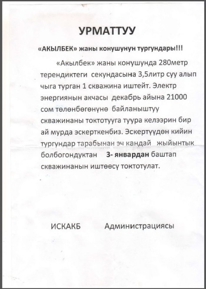 3 января жители начали активно выражать свое недовольство Водному департаментую айыл окмоту с. Кок-Жар, вплоть до желания перекрыть автодорогу Алматинская, стали собирать подписи для обращений в соответствующие органы.