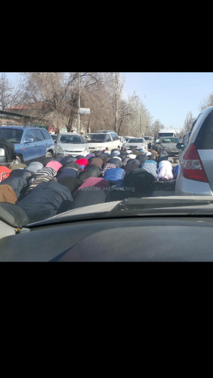 «Прошу ДПС МВД КР принять меры в районе мечети на улице Гоголя,так как во время пятничного намаза происходит вот такая картина, где люди молятся прямо на дороге.»
