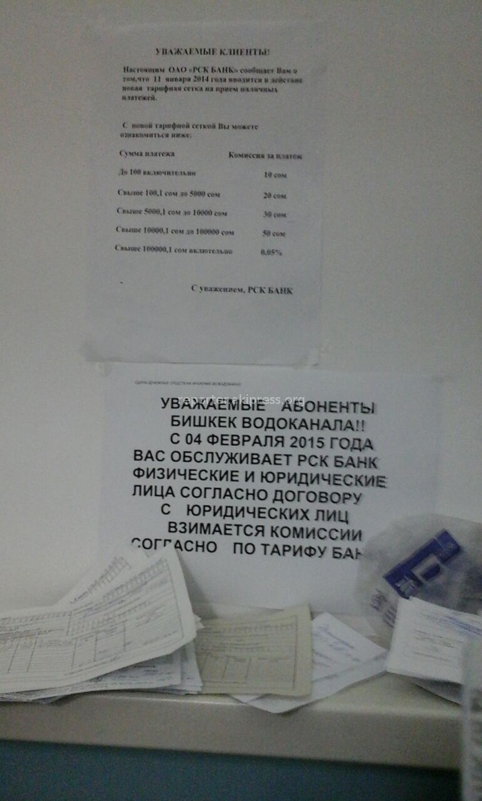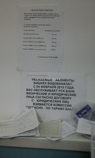 «В соответствии с постановлением правительства КР и Национального Банка КР №289/5/1 от 14 мая 2012года приложения №2 пункта 3.1. внутренняя касса управления на оказание услуг по приему платежей за отпуск питьевой воды и прием сточных вод закрыта, прием платежей за услуги производится на договорной основе Октябрьским филиалом ОАО «РСК Банк» по тарифам банка в момент совершения операции.
