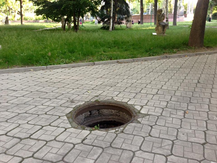«В Дубовом Парке на тротуаре нет крышки канализационного люка, а ведь столько народу с детьми гуляют. Просим принять меры».