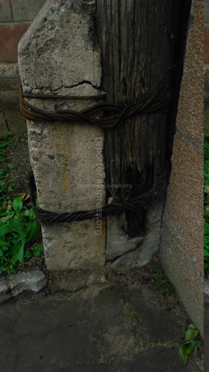 «На фотографии столб, про который мы публиковали информацию год назад. Столб не заменили, ссылаясь на каркас водного слива, замотали проволокой (как видно на фотографии).
