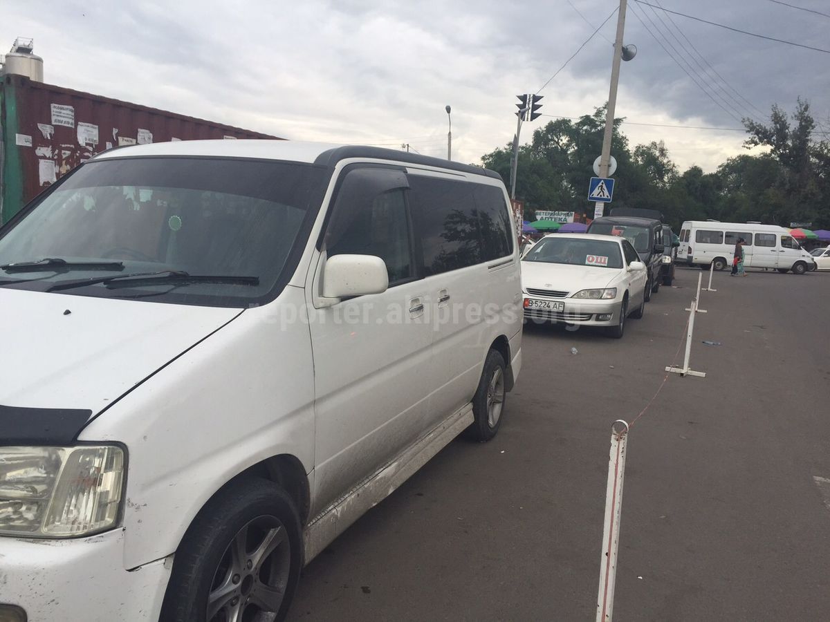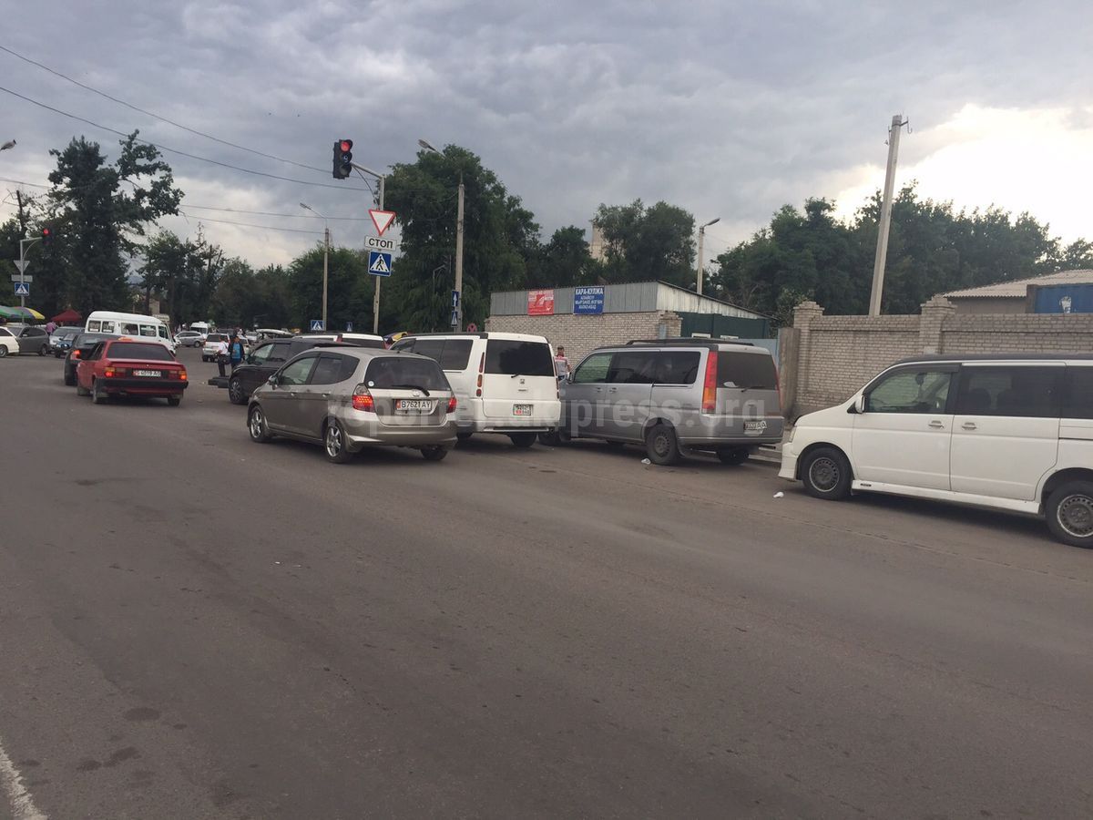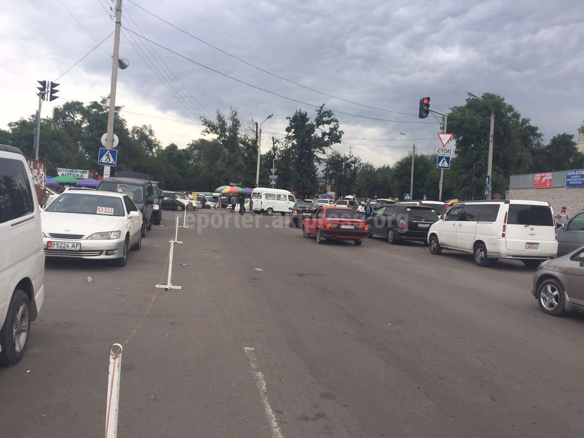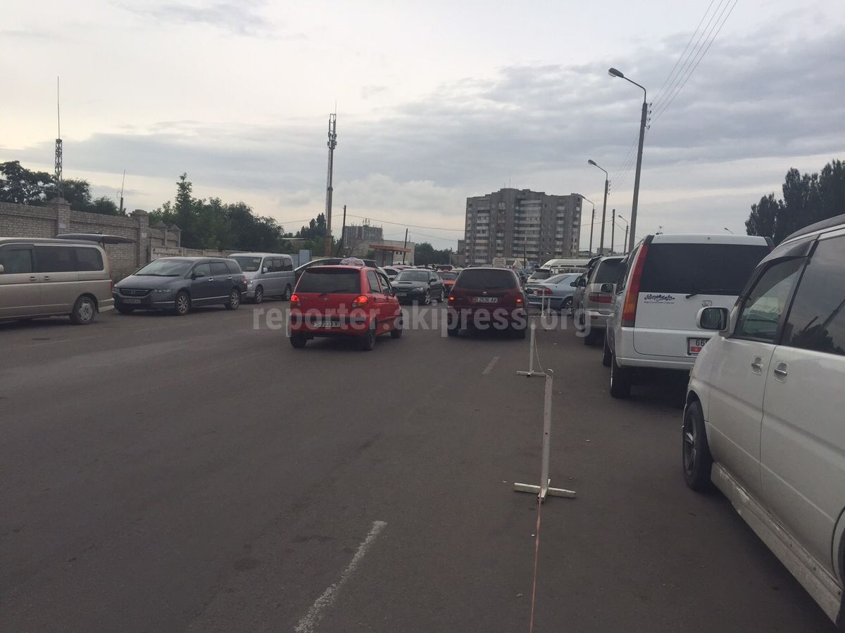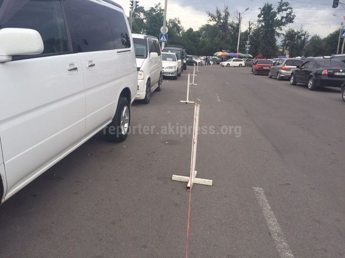 «На пересечении улиц Московская и Кулиева возле Ошского рынка таксисты, уезжающие на юг страны, самовольно сделали себе стоянку. Они перегородили свои автомобили специальной веревкой, привязанной к железным стойкам.