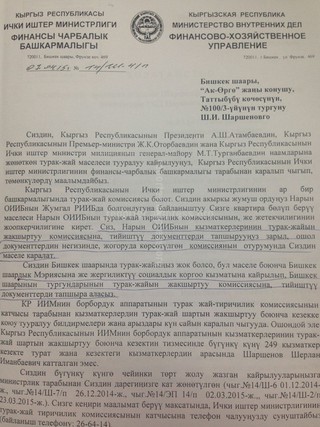 Уже 18 лет скитаюсь по съемным квартирам. Многократно обращался и обращаюсь по сей к министрам МВД. Не могу попасть на прием министра. «Высшее руководство» не принимает меня на личный прием. А «низшее руководство» отфутболивает меня, ущемляет мои права. Из Бишкека отправляют в Нарын, в Нарыне говорят, что жилья не будет. Обращался публично к известным политикам, они обещали помочь, говорили писать заявления на их имена, я так и делал.