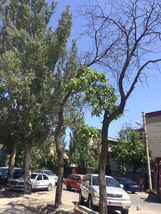 «На пересечении улиц Токтогула и Исанова находятся высохшие акации и гнилые тополя, которые опасны для людей и припаркованных машин, и там же стоит молочный ларек. Прошу принять меры».