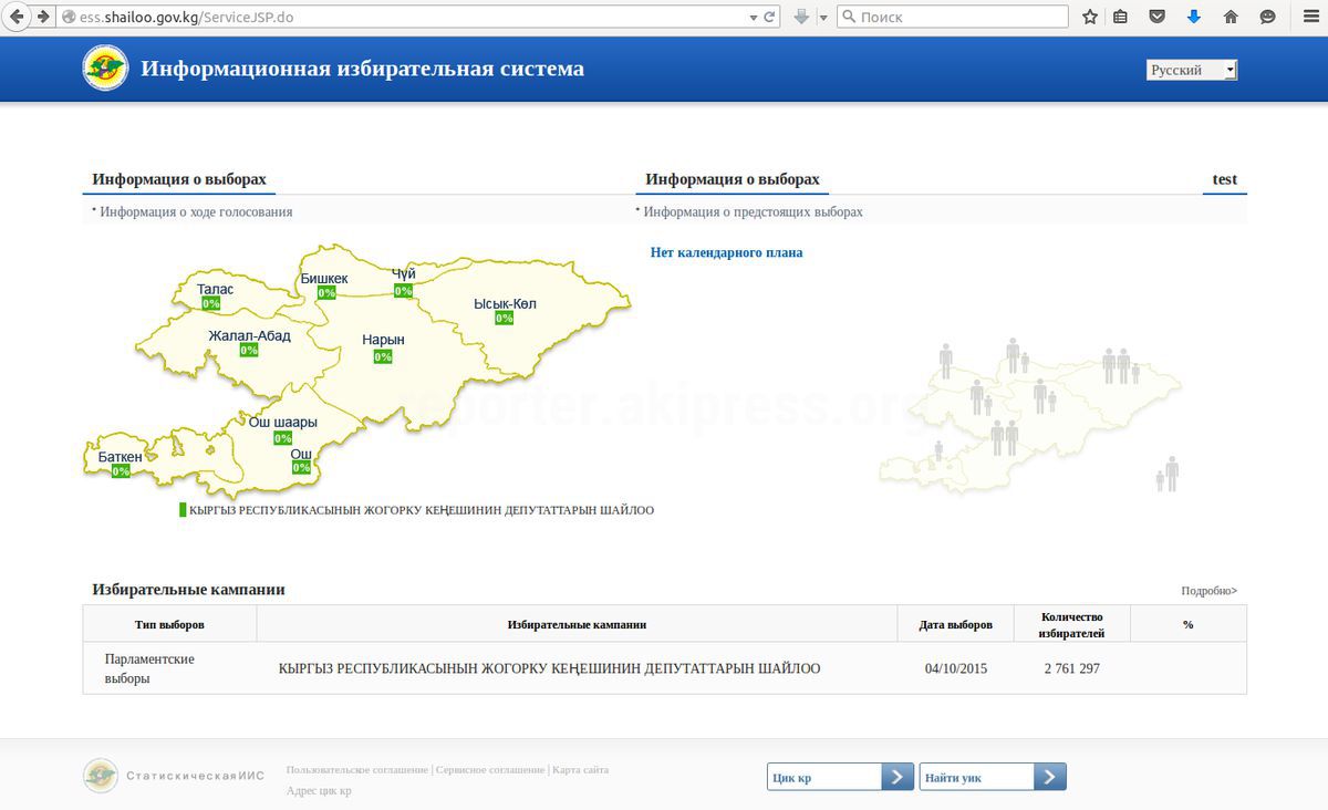 Читатель жалуется, что сайт информационной избирательной системы не работает (фото) 4 окт. 2015, 20:11 1887 Зачем надо было запускать этот сайт (http://ess.shailoo.gov.kg/), если ничего не обновляется, спрашивает читатель. Как сообщил он, сайт ЦИК (shailoo.gov.kg) долго грузится. 11 Есть новость? Сообщи нам по номеру 0550 01 03 11 или через приложение «Репортер АКИpress»! -Поделиться-Твиттер-WhatsApp- Телеграм 1887 Просмотры Читайте Репортер в t.me/ReporterAKIpress